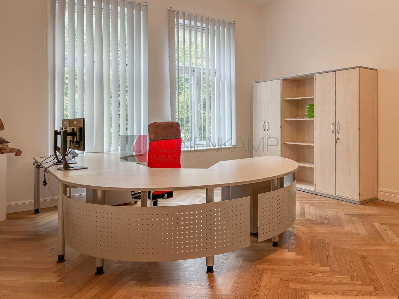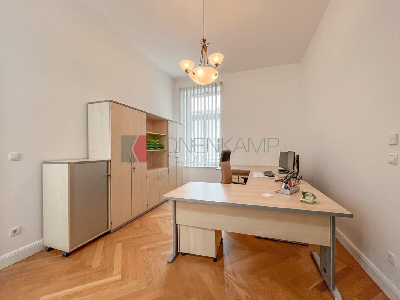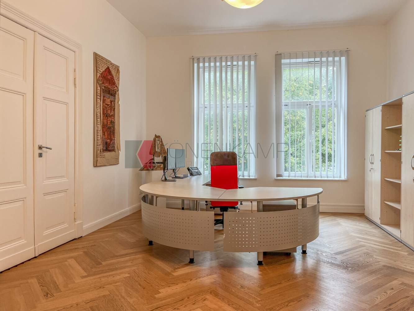 Das Denkmal Olof-Palme-Platz 3 ist im Jahr 2008 komplett saniert worden. Diese repräsentative Büroetage beeindruckt mit lichtdurchfluteten hohen Räumen inklusive Fußbodenheizung und hochwertigen Holzböden mit zahlreichen sanierten historischen und neu eingefügten Details. Das Büro selbst, mit beeindruckendem Eingangsbereich, befindet sich im 1. Obergeschoss des Denkmals und erstreckt sich komplett über dieses. Eine große Holzflügeltür mit Glaseinsätzen führt in den Flur der ca. 206 m² großen Einheit. Geschickt eingebaute Milchglasfenster unterstützen das Eindringen des Tageslichts in den Flur. Ein Warteraum sowie ein Empfangsbereich sind ebenso selbstverständlich wie eine Küche bzw. Pausenraum und zwei separate WC‘s.