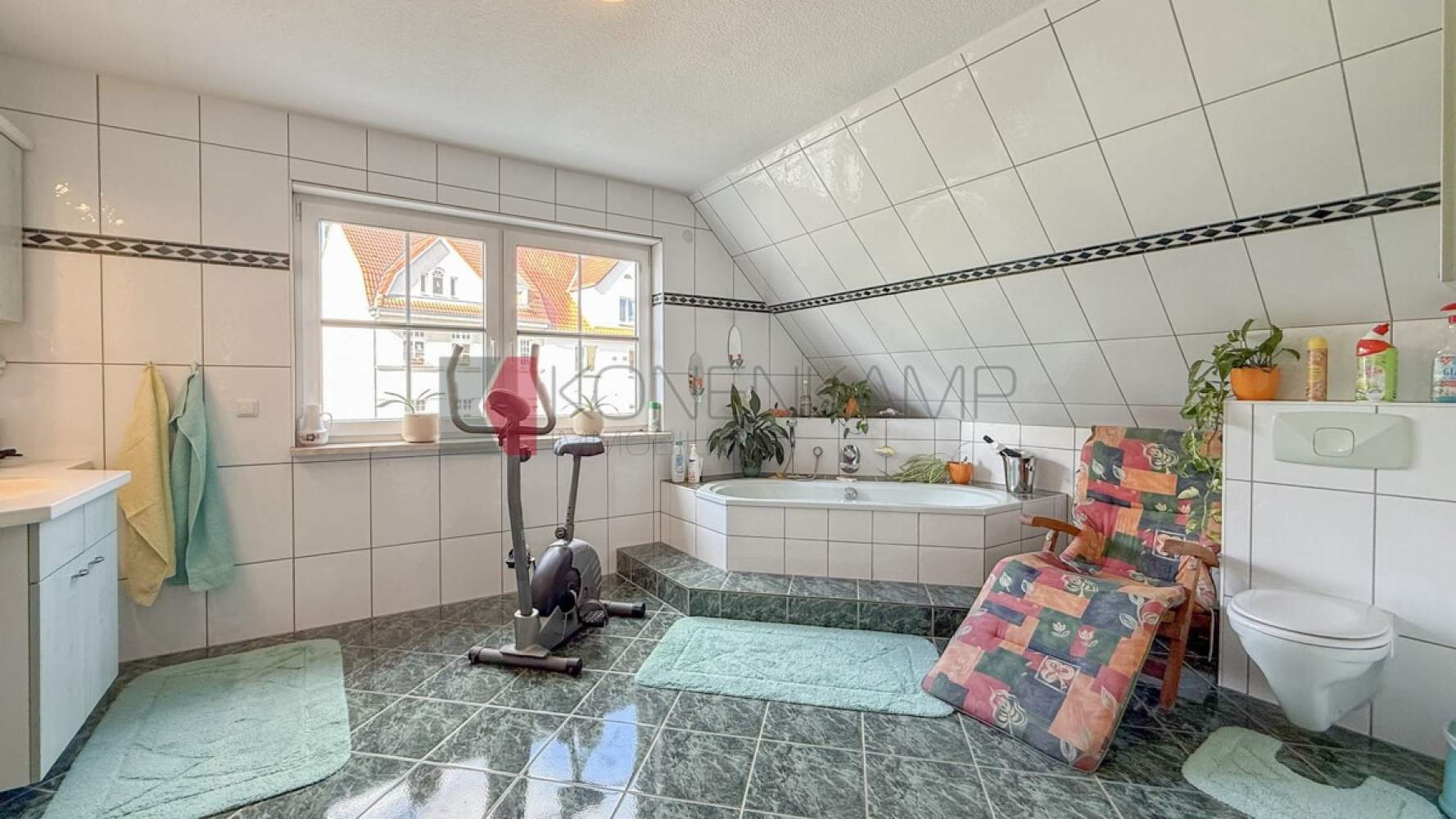 Im Obergeschoss befinden sich das Schlafzimmer mit Ankleide, ein weiteres Zimmer sowie das großzügige Tageslichtbad mit Wanne und Dusche.