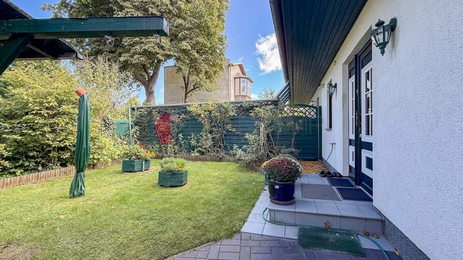 Das rund 348 m² große Grundstück ist pflegeleicht angelegt, mit überdachter Terrasse und blickgeschütztem Gartenbereich. Eine massive Garage mit elektrischem Tor rundet das Angebot ab.