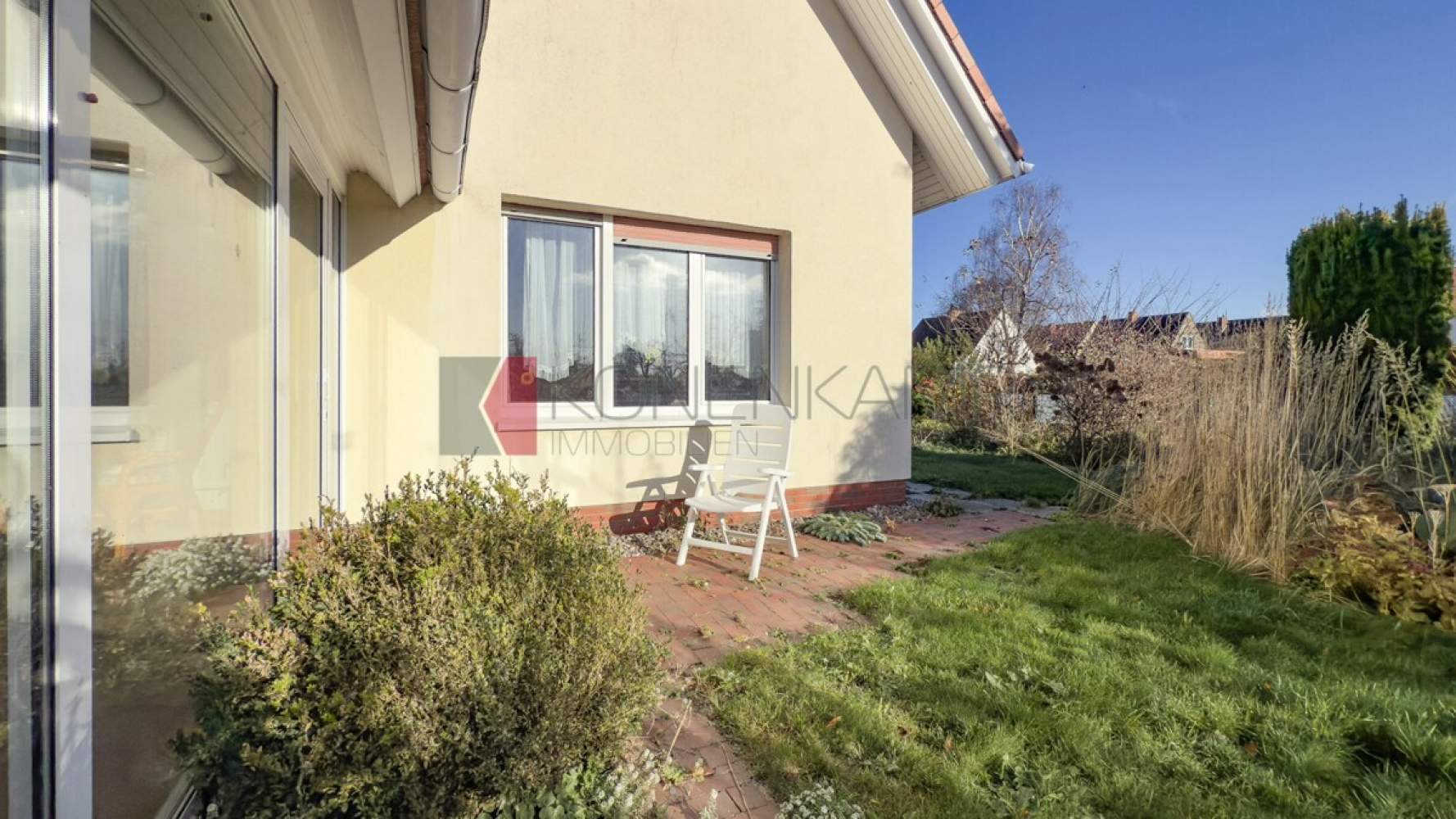 Ein schöner großer Garten verleiht diesem Haus das Gefühl von Wohnen im Grünen. Die Südterrasse lädt zum Sonnen und Genießen ein. Eine zweite Terrasse – eingefriedet wie ein kleiner Innenhof – schenkt Wind- und Blickschutz für entspannte Momente ohne fremde (Ein)Blicke. Kleine Goodies wie das Gewächshaus und ein kleiner Schuppen verlängern die Gartensaison.