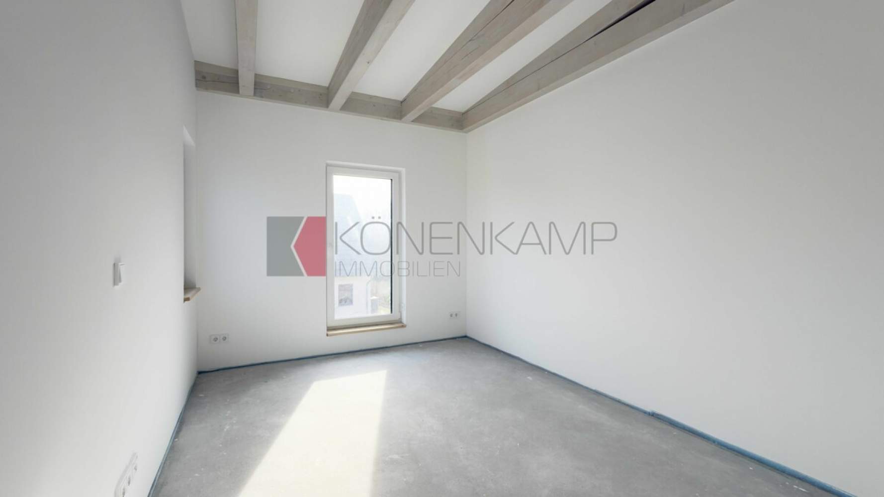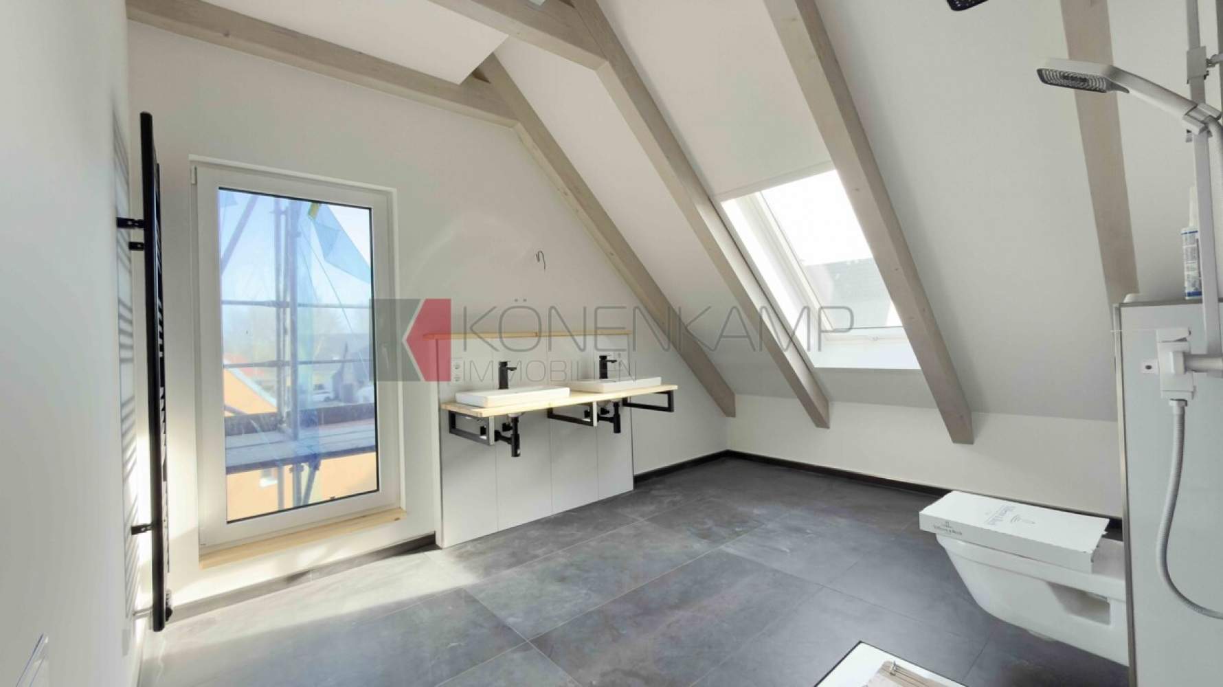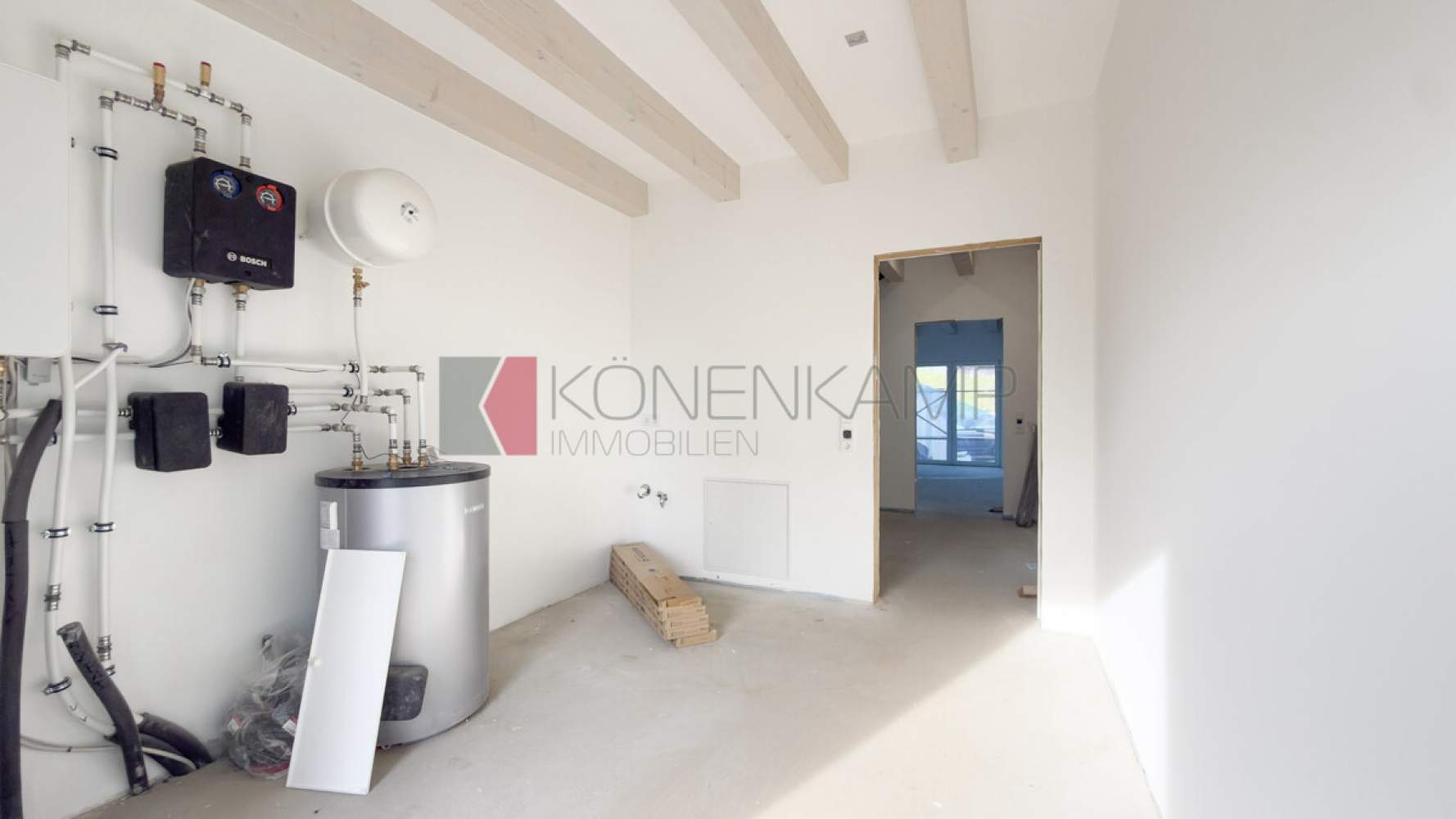 Die Zimmer verfügen in der Dachfläche über große Dachfenster-Lichtelemente von Velux, bzw. über Boden stehende Fenster. Das Haus ist mit hochwertigen Materialien ausgestattet, darunter mit einer vollflächigen modernen Fußbodenheizung in allen Zimmern und auf allen Etagen. Die Wärme wird auf der Basis hoch energieeffizienter Heiztechnik mit Luft-Wasser Wärmepumpentechnologie erzeugt. Schützend um das Haus wurde eine wärmegedämmte mineralische Putzfassade mit ökologisch unbedenklicher Wärmedämmung und einem hoch wärmegedämmten Fußboden im Erdgeschoss verbaut.