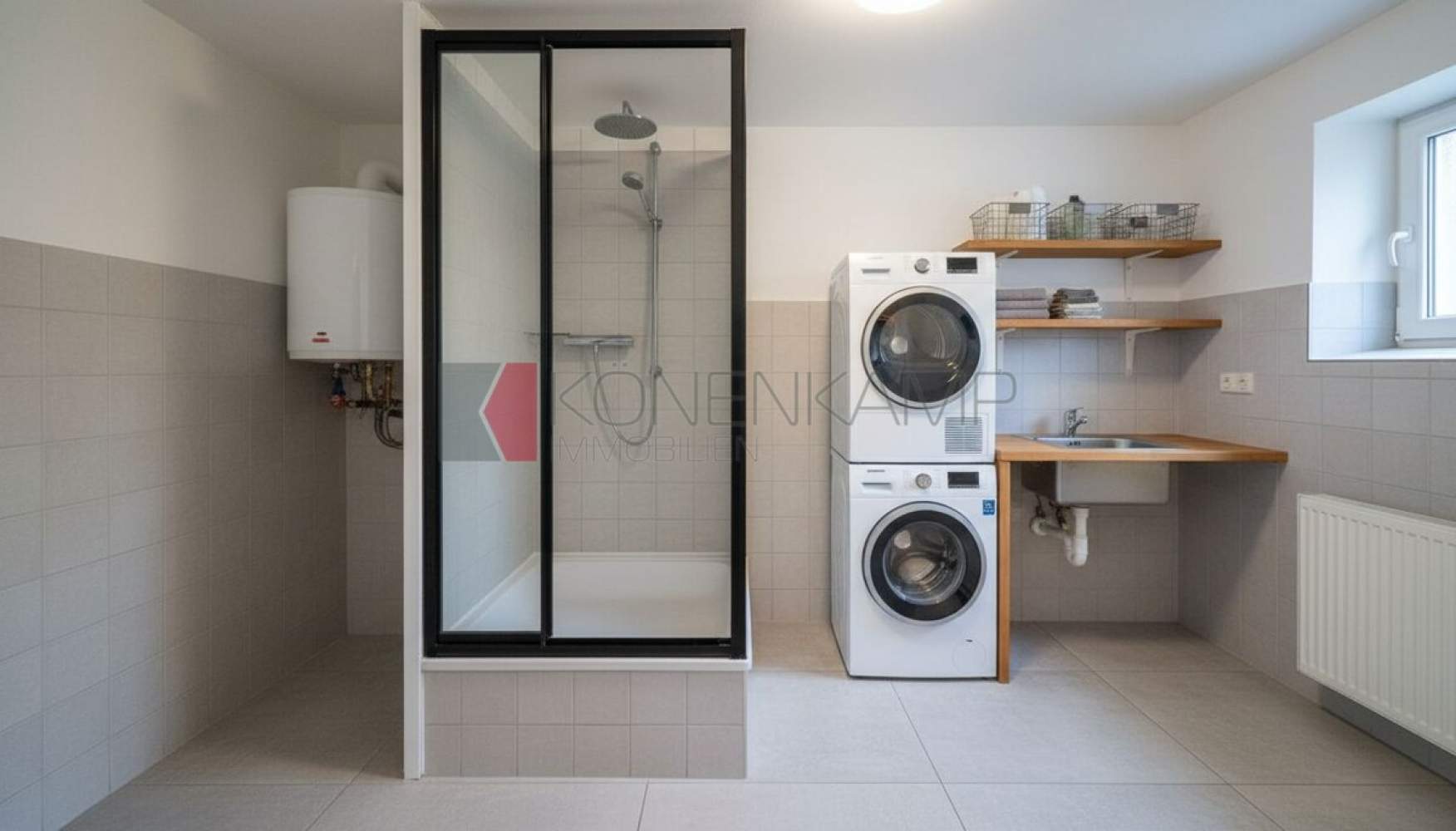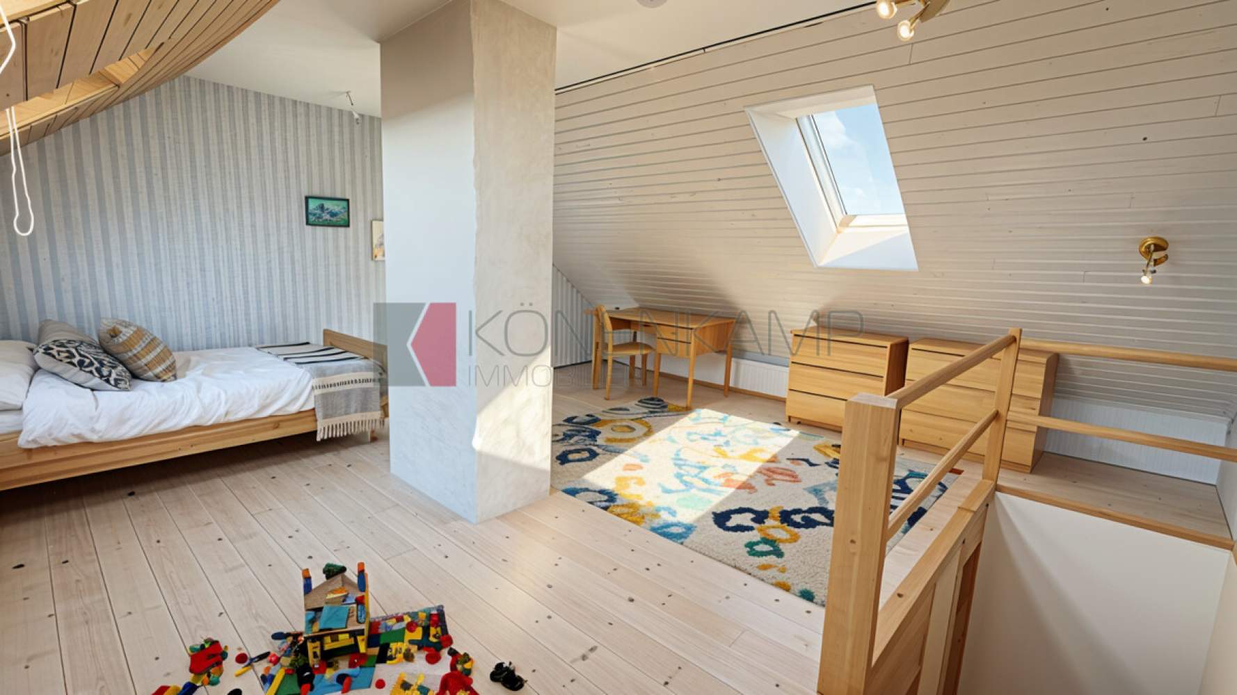 Das ausgebaute Dachgeschoss schafft zusätzlichen Wohnraum, während die klare Grundrissstruktur vielseitige Nutzungsmöglichkeiten bietet. So ist ein zweites Badezimmer im Untergeschoss auch möglich. Die massive Bauweise und der gepflegte Zustand unterstreichen das Potenzial dieser Immobilie.