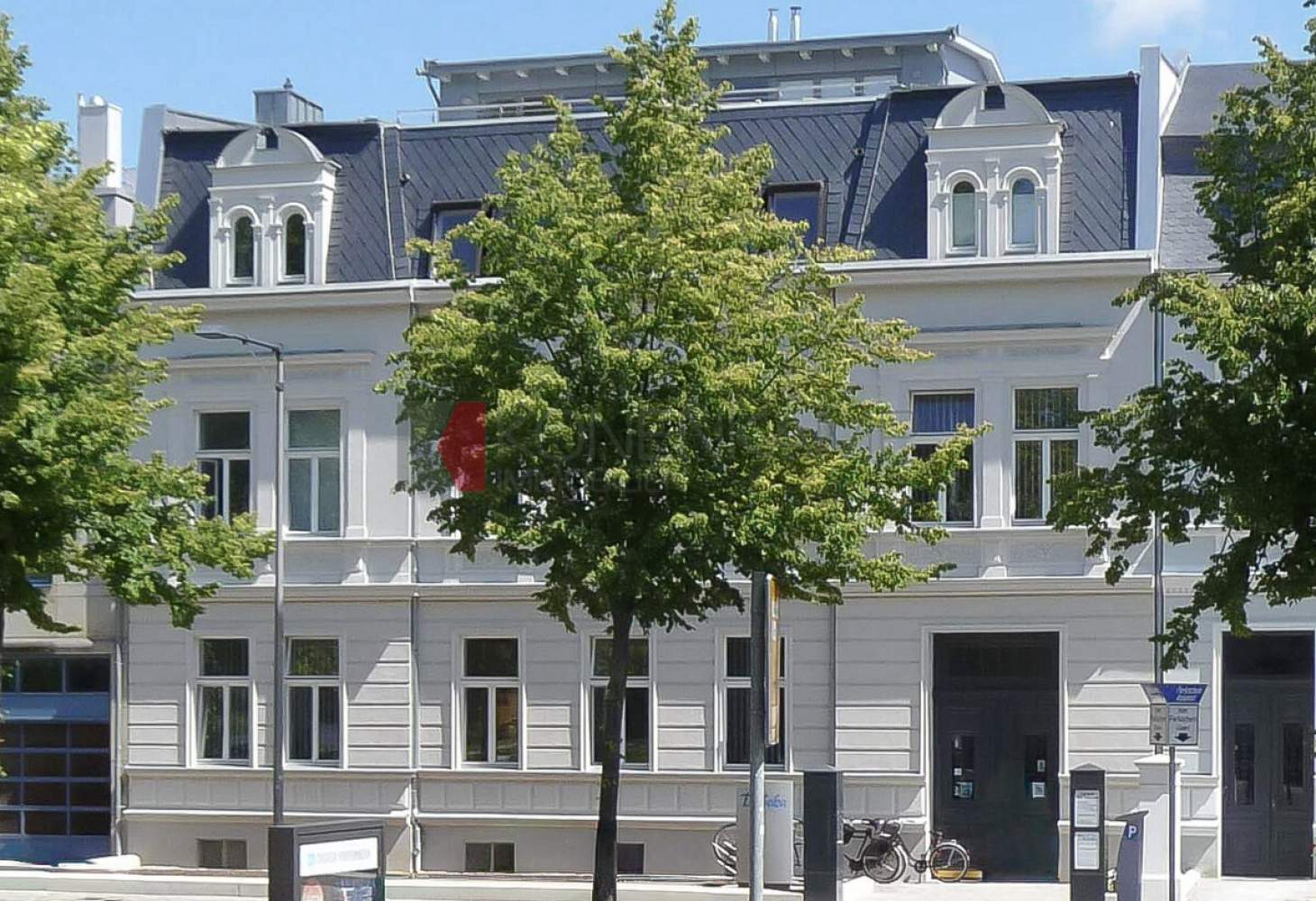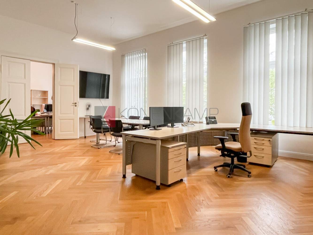 Das Denkmal Olof-Palme-Platz 3 ist im Jahr 2008 komplett saniert worden. Diese repräsentative Büroetage beeindruckt mit lichtdurchfluteten hohen Räumen inklusive Fußbodenheizung und hochwertigen Holzböden mit zahlreichen sanierten historischen und neu eingefügten Details. Das Büro selbst, mit beeindruckendem Eingangsbereich, befindet sich im 1. Obergeschoss des Denkmals und erstreckt sich komplett über dieses. Eine große Holzflügeltür mit Glaseinsätzen führt in den Flur der ca. 206 m² großen Einheit. Geschickt eingebaute Milchglasfenster unterstützen das Eindringen des Tageslichts in den Flur. Ein Warteraum sowie ein Empfangsbereich sind ebenso selbstverständlich wie eine Küche bzw. Pausenraum und zwei separate WC‘s.