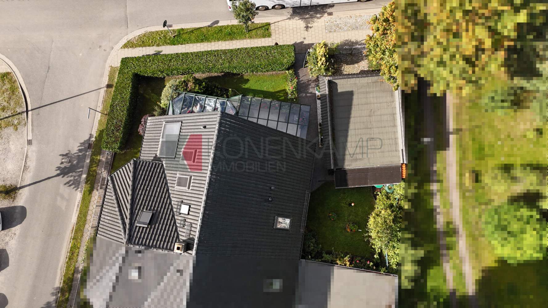 Das rund 348 m² große Grundstück ist pflegeleicht angelegt, mit überdachter Terrasse und blickgeschütztem Gartenbereich. Eine massive Garage mit elektrischem Tor rundet das Angebot ab.