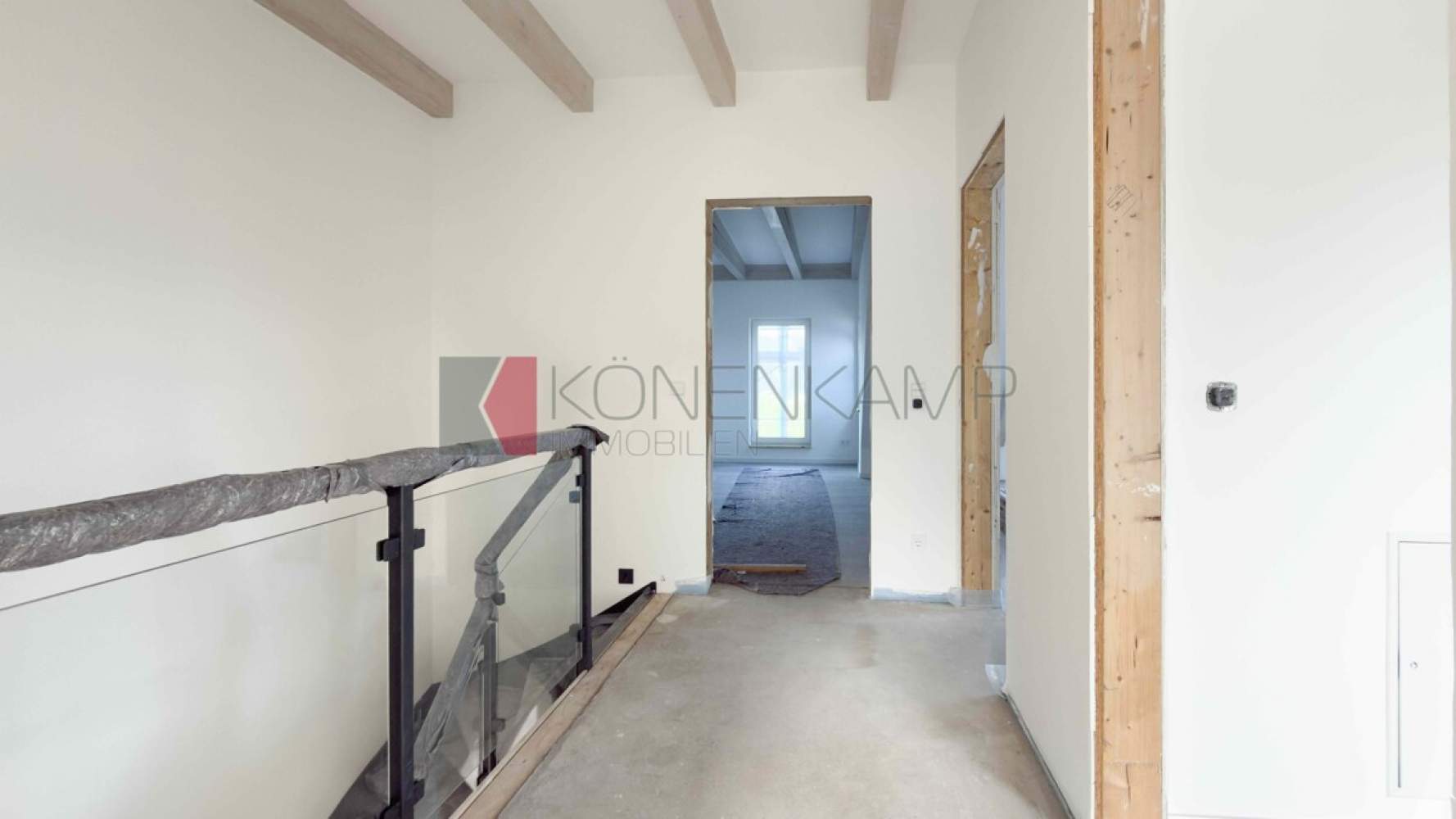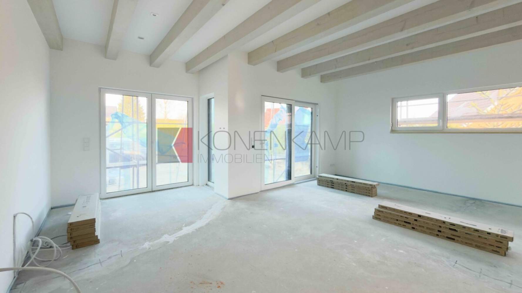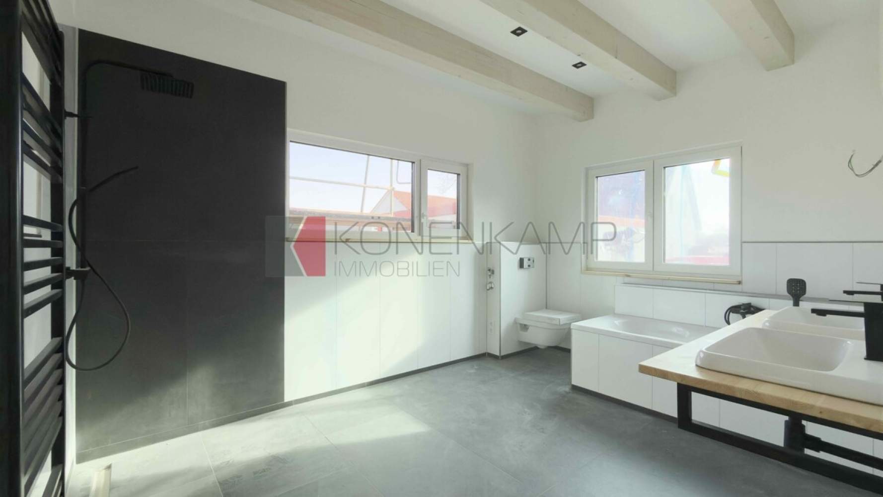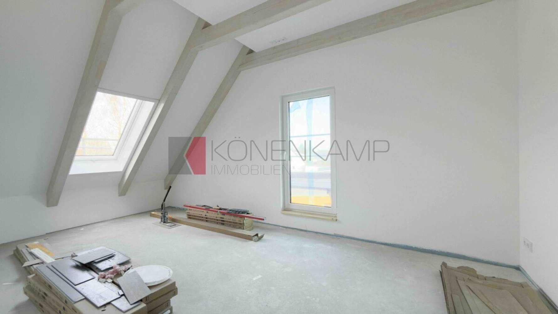 Die Zimmer verfügen in der Dachfläche über große Dachfenster-Lichtelemente von Velux, bzw. über Boden stehende Fenster. Das Haus ist mit hochwertigen Materialien ausgestattet, darunter mit einer vollflächigen modernen Fußbodenheizung in allen Zimmern und auf allen Etagen. Die Wärme wird auf der Basis hoch energieeffizienter Heiztechnik mit Luft-Wasser Wärmepumpentechnologie erzeugt. Schützend um das Haus wurde eine wärmegedämmte mineralische Putzfassade mit ökologisch unbedenklicher Wärmedämmung und einem hoch wärmegedämmten Fußboden im Erdgeschoss verbaut.